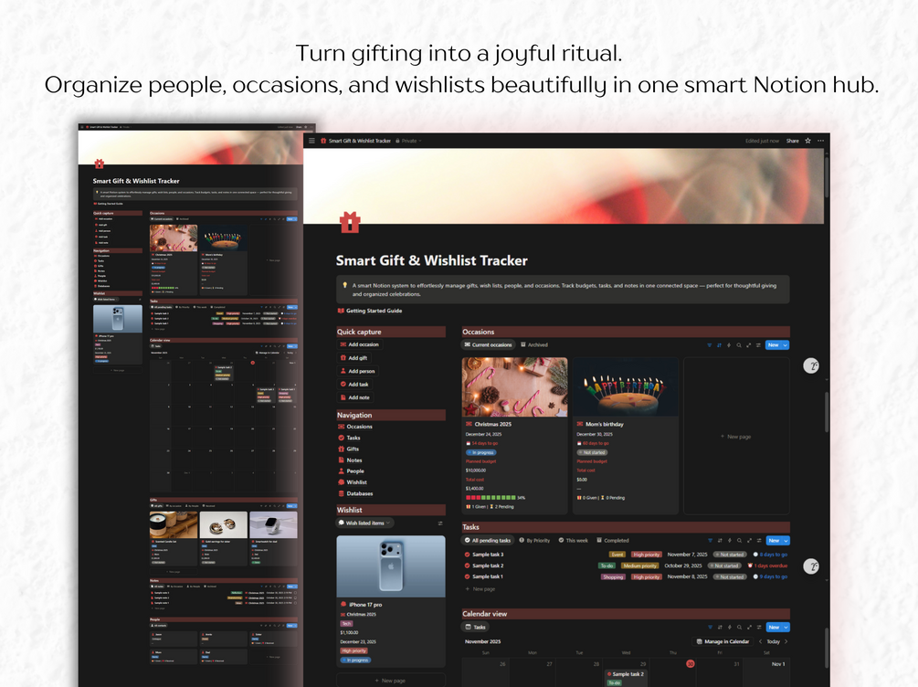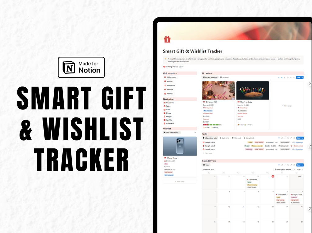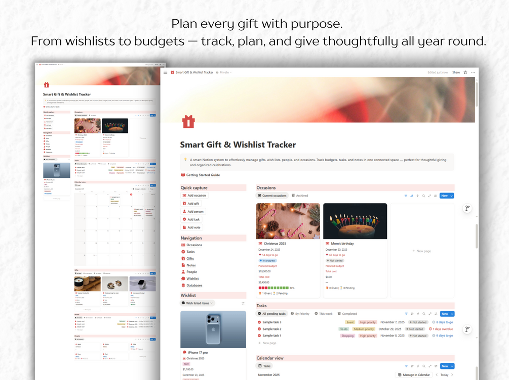The Smart Gift & Wishlist Tracker is your all-in-one Notion system for organized, intentional gifting. Effortlessly manage every occasion — from planning gifts and budgets to tracking wishlists, people, and personal notes.